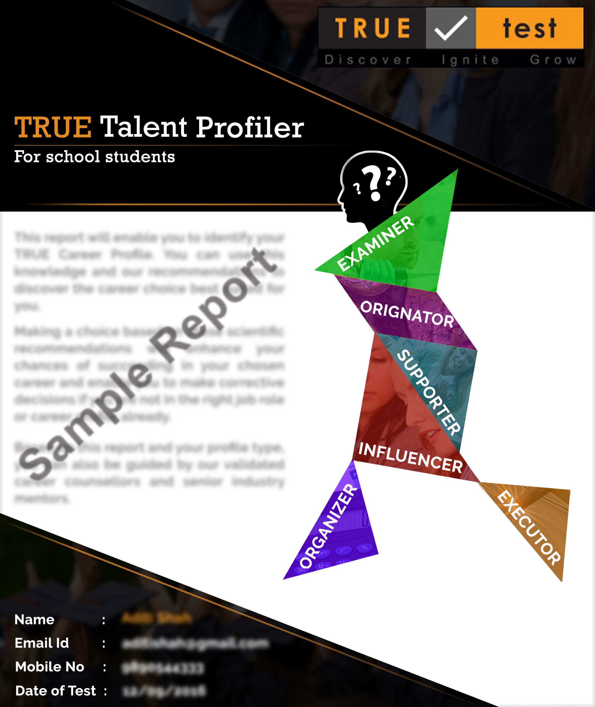 At the end of the TRUE Talent Profiler test, you will know what category best describes your child. For instance, the child could either be an Executor (Realistic) or an Examiner (Investigative) or an Originator (Artistic) or a Supporter (Social) or an Influencer (Enterprising) or an Organizer (Conventional). It is also possible that the child might have an equal score for more than one category mentioned above. In which case, they could have a sub-conscious preference for activities or pursuits that match more than one category.